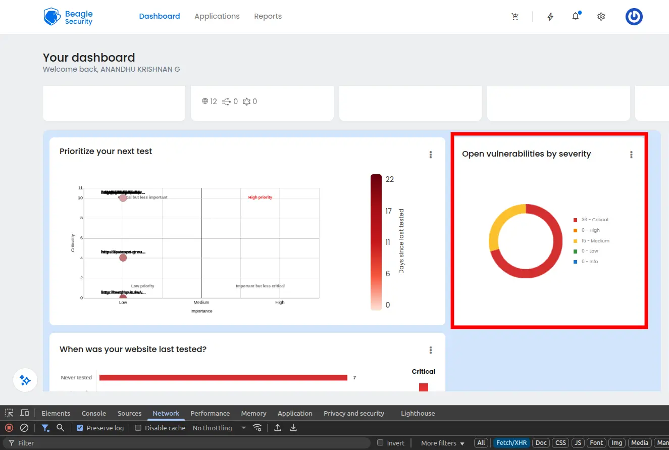 Beagle Security provides two primary reporting views: The application dashboard and the results dashboard.