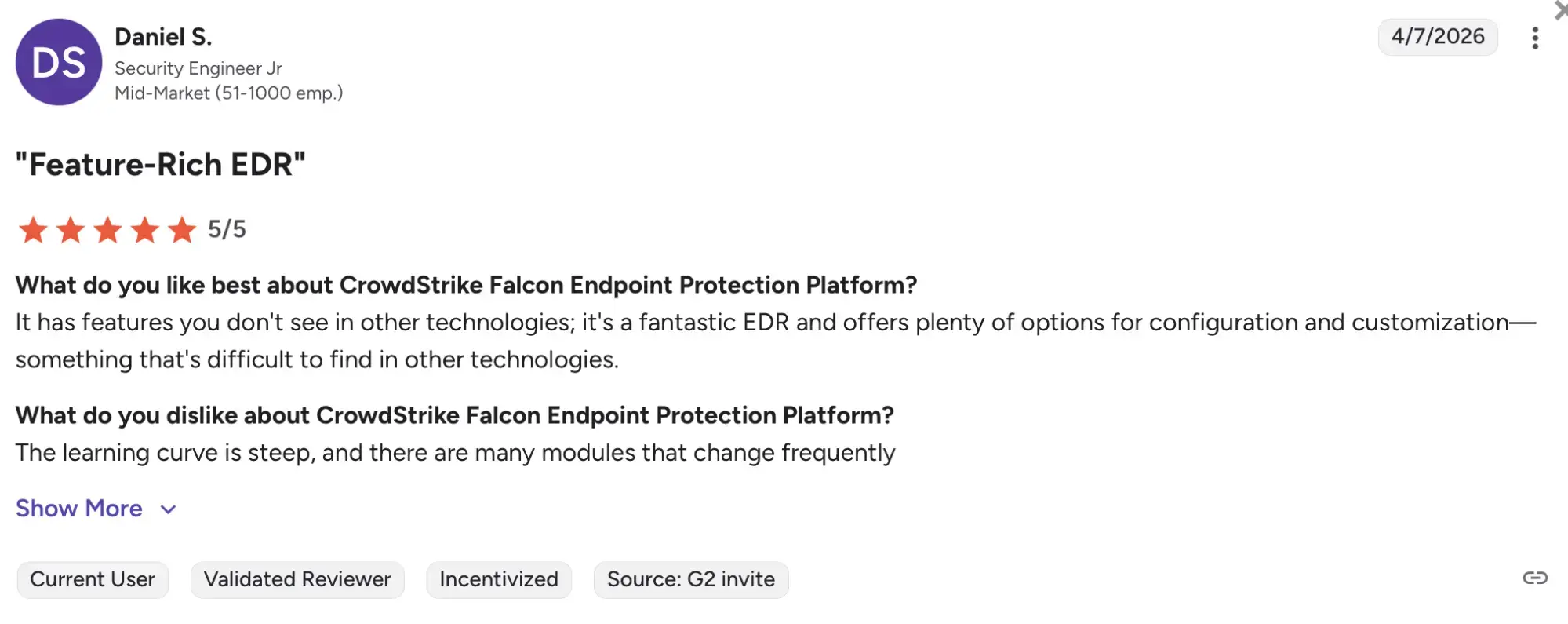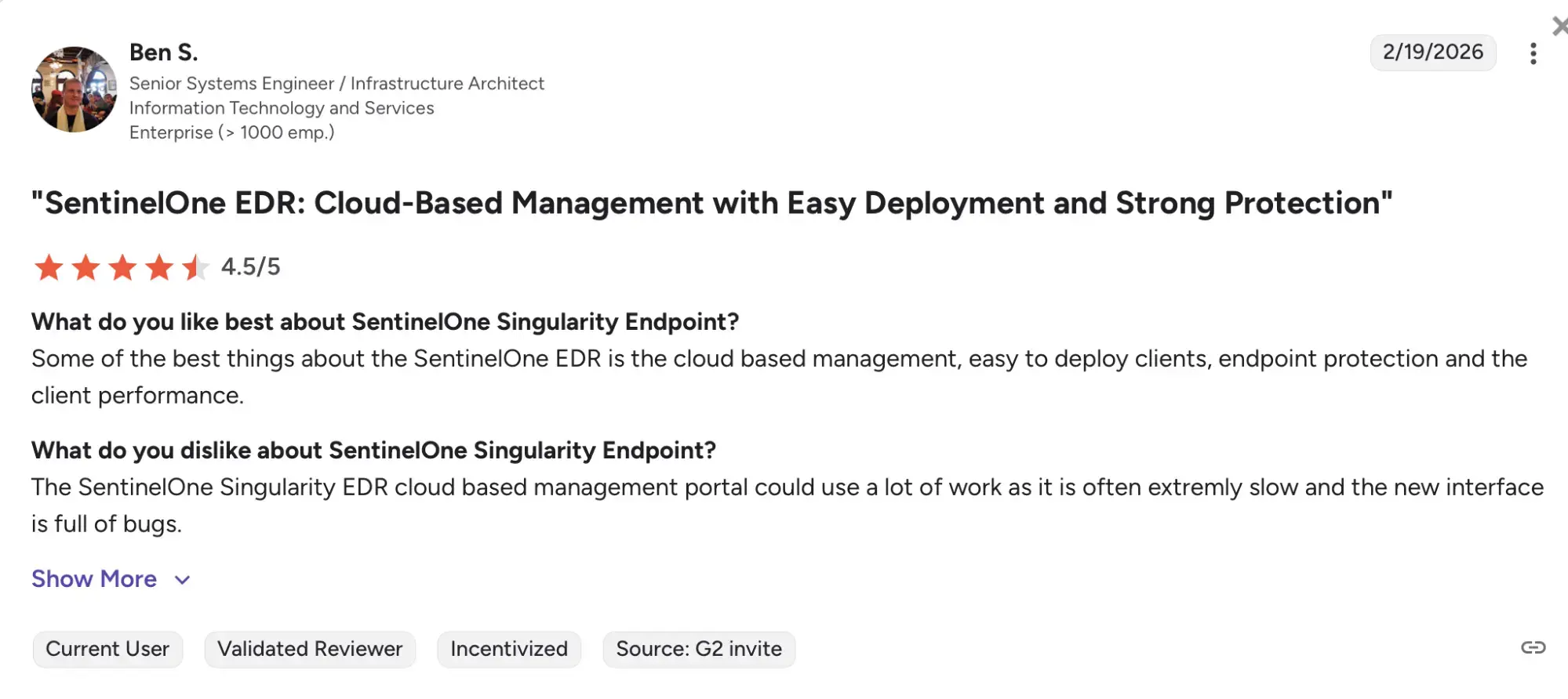 Based on 356 reviews, SentinelOne as a whole, has a G2 rating of 4.7/5.