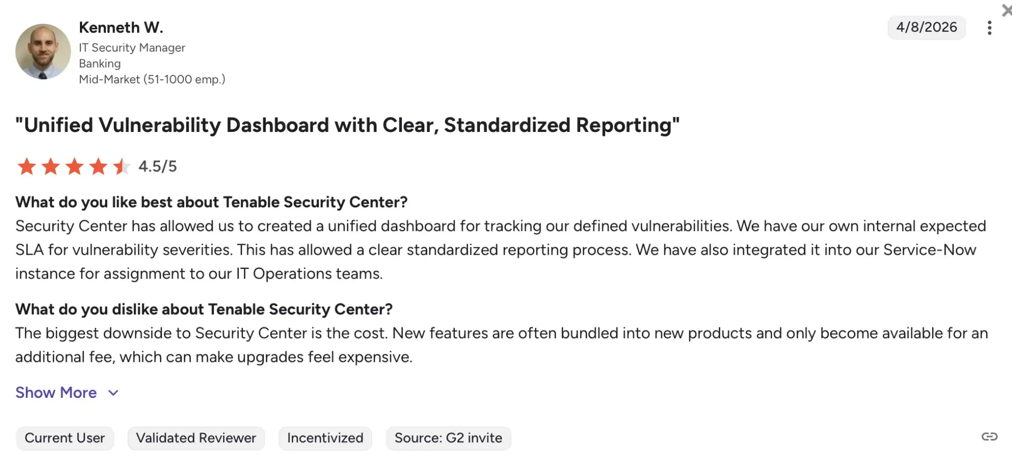 Based on 563 reviews, Tenable product catalogue has a total rating of 4.5/5 on G2.