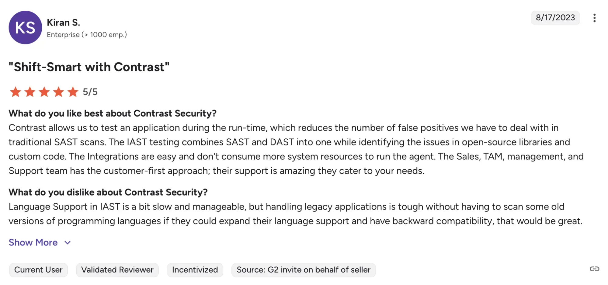 Contrast Security maintains an excellent 4.5/5 G2 rating, driven by extremely positive feedback about its runtime-based accuracy. Reviewers emphasize that Contrast’s IAST and RASP instrumentation significantly reduce false positives because findings are validated in real application execution.