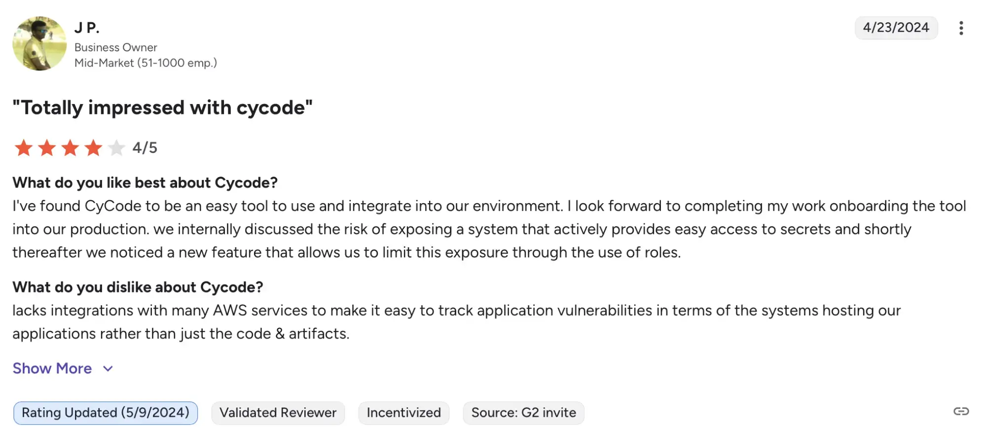 Cycode is rated 4/5 on G2, with users praising its SDLC-wide visibility and ability to correlate risks across source control, CI/CD pipelines, cloud infrastructure and deployment environments.