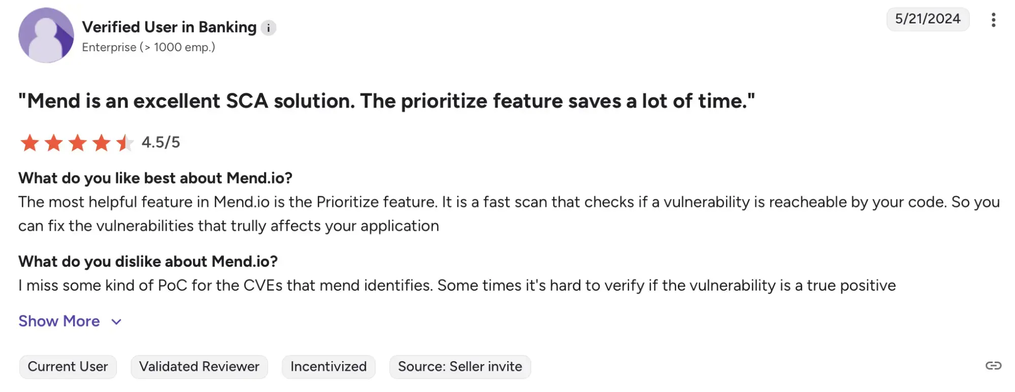 Mend.io holds a 4.3/5 rating on G2, largely due to its accuracy in SCA scanning, detailed open-source license compliance and enterprise-grade SBOM support. Users highlight how Mend automates dependency governance across large portfolios and provides clear insights into legal, security and compliance risks.