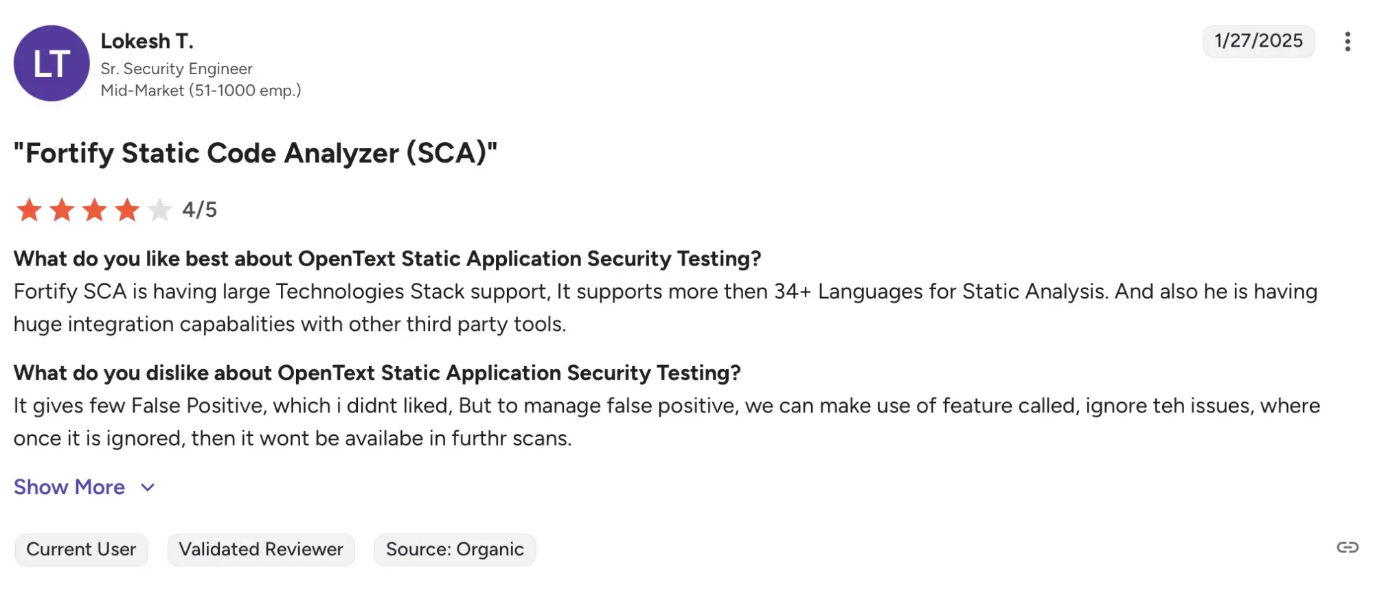 OpenText Fortify holds a 4.5/5 rating on G2, with users praising its robust static analysis, extensive language support and strong on-premise deployment options. Reviewers highlight the Software Security Center (SSC) as a valuable dashboard for tracking vulnerabilities across large portfolios and enforcing enterprise-wide policies.