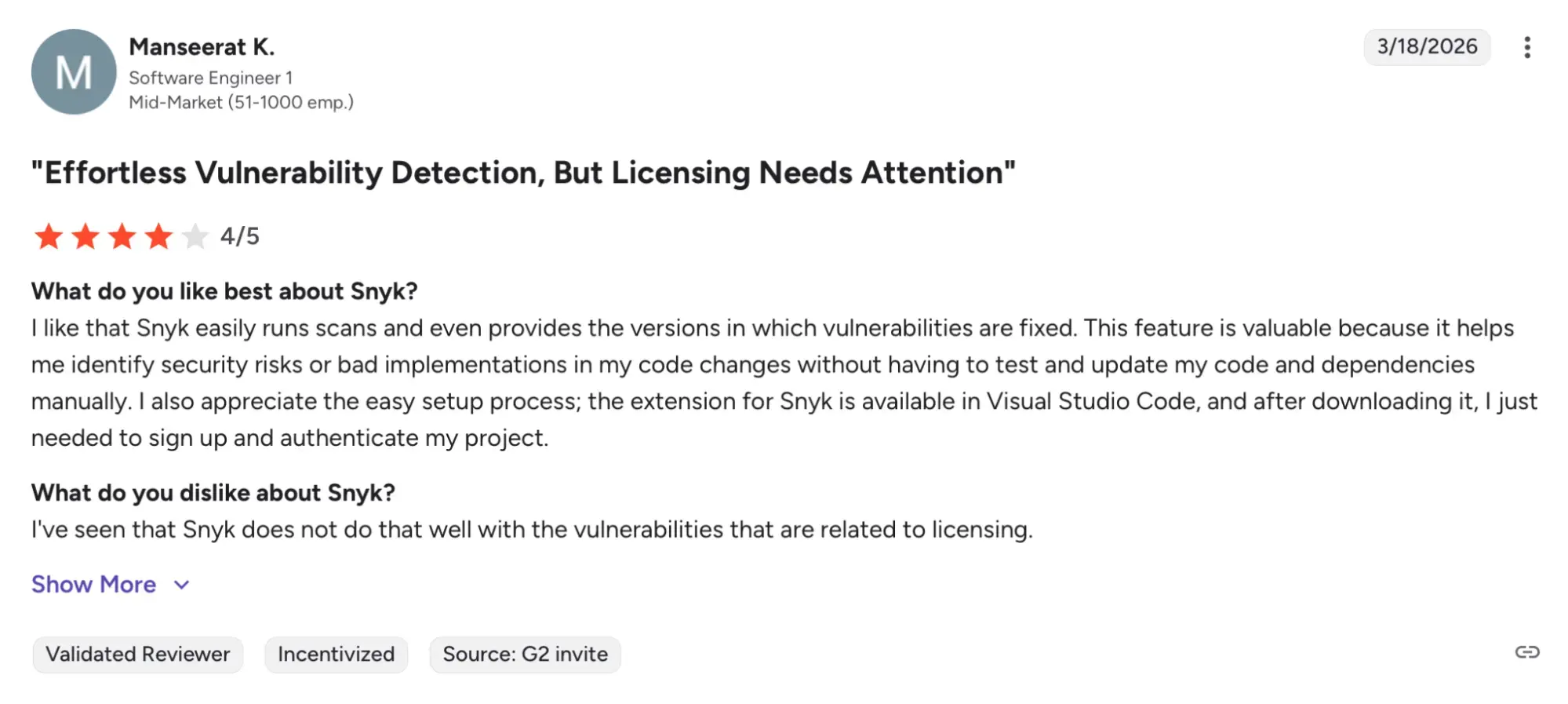 Snyk enjoys an impressive 4.5/5 G2 rating, reflecting its strong adoption among developers and DevOps teams. Users love how seamlessly Snyk fits into everyday workflows, offering fast SCA, container and IaC scans along with automated PRs for dependency upgrades. Some reviewers also note that pricing scales with team size.