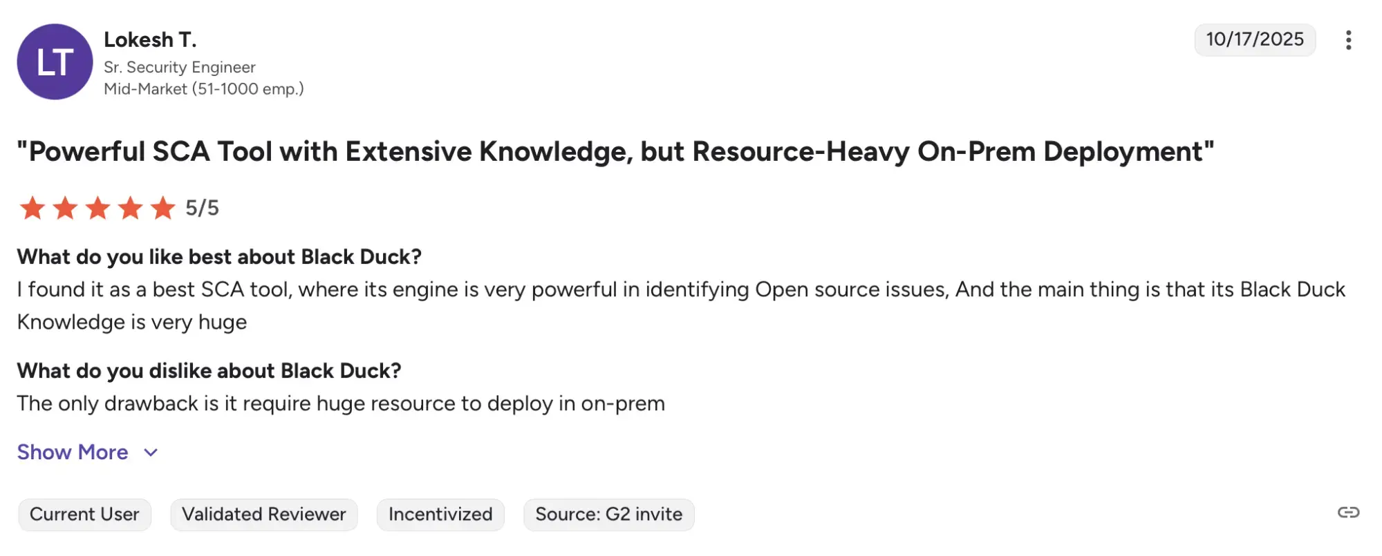 Black Duck has a G2 rating of 4.0/5. Users commend Black Duck for its accuracy and comprehensive coverage. Its strength lies in serving heavily regulated industries where compliance and governance are non-negotiable. However, smaller teams often find it too costly and complex.