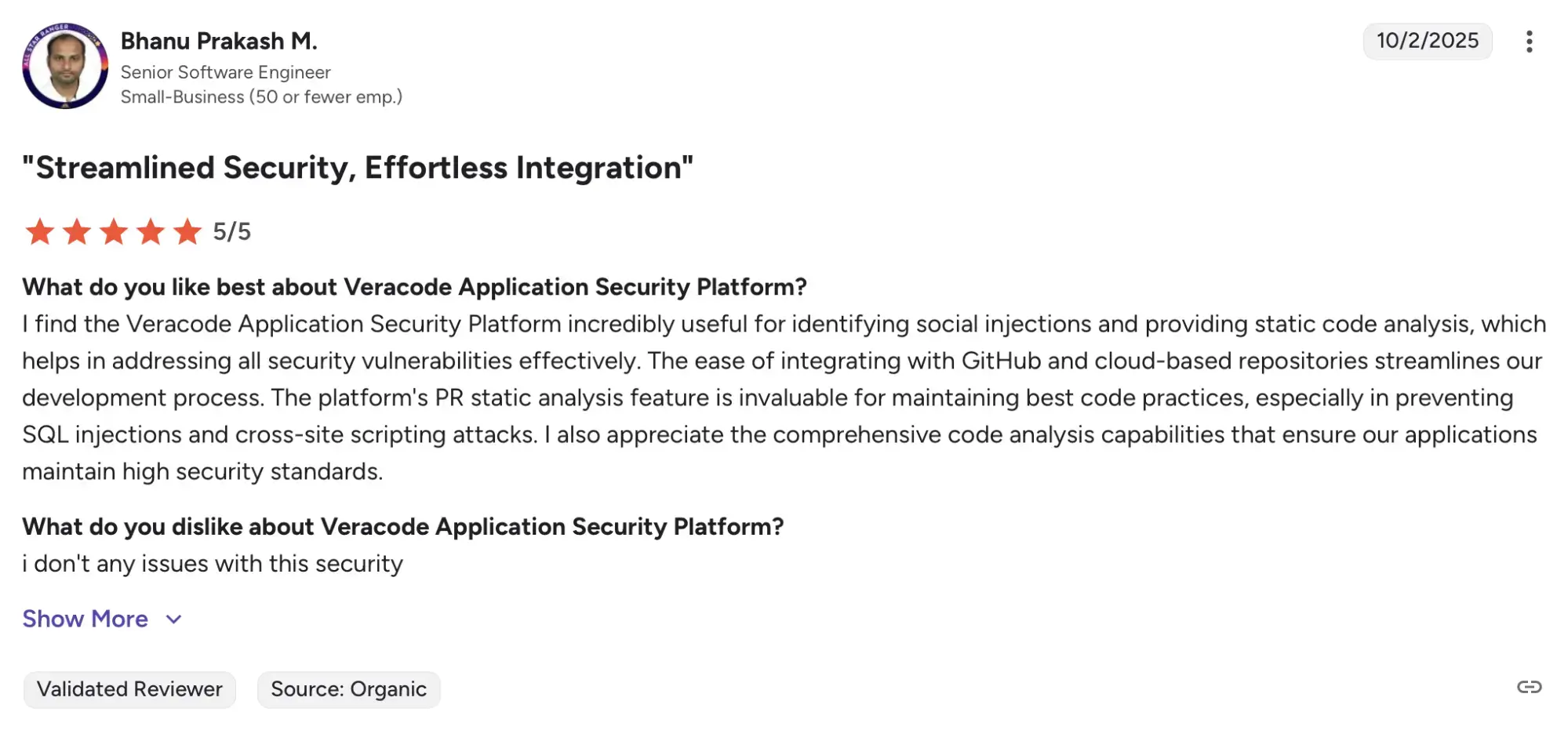 Veracode holds a G2 rating of 3.8/5. Users value its strong compliance features and detailed governance but often point out complexity in licensing and slower support compared to developer-first tools. It is considered best suited for enterprises with strict audit requirements.